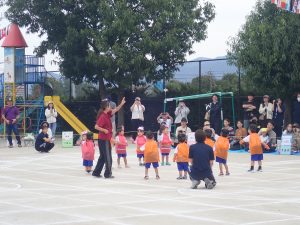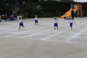 続いては年少さんの競技です。かけっこ、玉入れ、ダンスをしました。