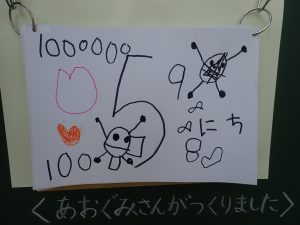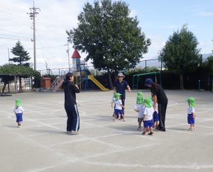 こちらはダンスの練習です。丸くなってお友だちや先生の顔を見ながら楽しそうに踊っています。指はチョキ、カニさんかな?