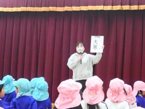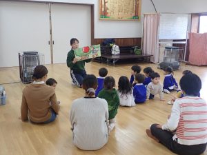 幼稚園の子どもたちの体操が終わった後、遊具の準備をしている間に紙芝居を見ました。満3歳児のつぼみ組さんも一緒です。