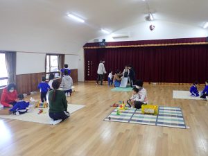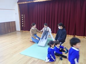 今日は幼稚園開放を行いました。未就園のお友だちが幼稚園に遊びに来てくれました。外は寒かったので、体育館で遊ぶことにしました。