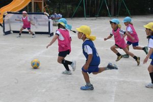 さあ、試合開始!みんなでボールを追いかけます。相手チームにボールを渡さないように!キーパーはしっかりゴールを守って!