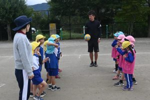 年中さんも試合をします。二つのチームが向かい合って「お願いします!」
