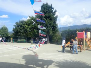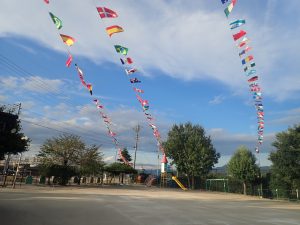 万国旗が風になびいています。園庭は広々ときれいになりました。さあ、いよいよ運動会です!
