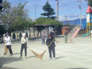 トラックをきれいに掃いて整えました。土埃が立って大変でしたが、ご協力のおかげでみるみるきれいになりました!これで思い切りかけっこができるね。