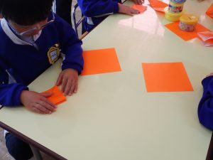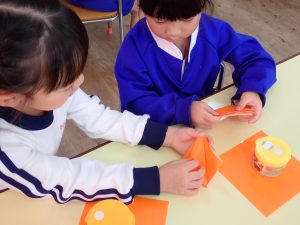 オレンジ色の折り紙でかぼちゃを折りました。折り方が少し難しいですが、先生の説明を聞きながら一生懸命折っている年中さんです。