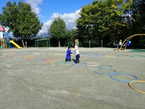 じゃんけんゲームをしていたのですね!両側からスタートしてフラフープを一つずつ進み、出会ったところで “ジャンケンポン!” 勝ったらそのまま進みます。負けたらスタートに戻って次のお友だちにバトンタッチ。相手チームのスタートラインに先に到着したチームの勝ちです。ジャンケンをする元気な声が園庭に響いていました。