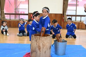 年中さんと年少さんは二人で力を合わせてつきます。周りのお友だちから「よいしょー!よいしょー!」の掛け声がかかります。