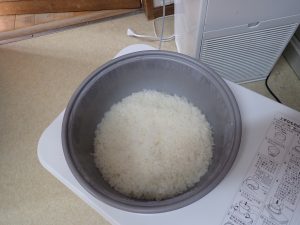 職員室では一晩水に浸けたもち米を蒸して、もちつき会の準備です。