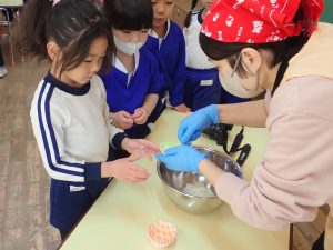 先生がつきたてのおもちを持って、子どもたちの前を回ります。教室で食べたもち米がこんな風に変身したんだね。