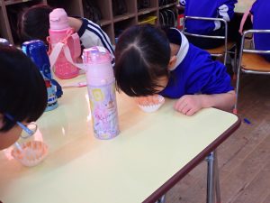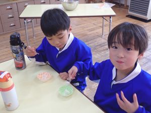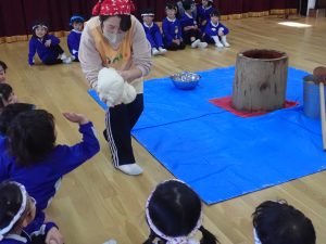 今日はみんなが楽しみにしていたもちつき会です。うれしくて、ベレー帽の代わりに “ねじりはちまき” をして登園してくるお友だちもいましたよ。