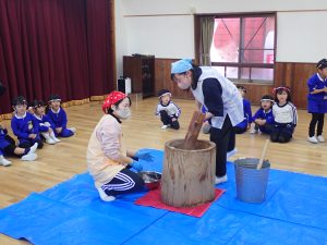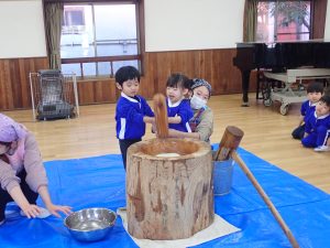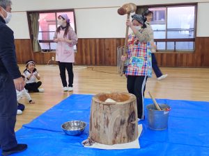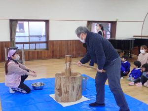 年中さんと年少さんは二人で力を合わせてつきます。周りのお友だちから「よいしょー!よいしょー!」の掛け声がかかります。