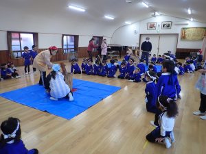 体育館に集まって、いよいよもちつき会のはじまりです。