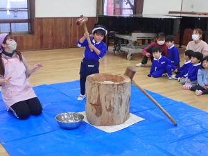 年長さんは一人で杵を持ちます。さすがは年長さん。力強いですね。