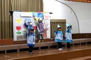 さあ、クリスマス会のはじまりです。まず、すみれ組さんのオペレッタ『くれよんのくろくん』を見ていただきました。このオペレッタは、12月はじめの発表会でおうちの方々に発表したものです。「ぜひ、小さいお友だちに見てもらいたい!」と、すみれ組さんがはりきって発表しました。