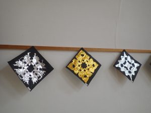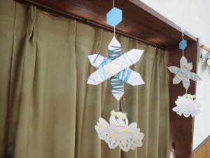 これは年長さんが作った雪の結晶です。金と銀の折り紙で作りました。キラキラしてとてもきれいです。