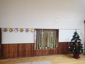 会場の体育館には幼稚園の子どもたちが作った飾りや大きなクリスマスツリーを飾って、小さいお友だちをお迎えする準備は万端です。